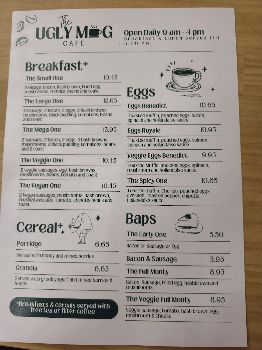 The menu at The Ugly Mug Cafe offers a mouthwatering selection of breakfast and snack options that cater to a variety of tastes. Popular dishes include the tantalizing Eggs Royale—a delightful combination of toasted muffin topped with poached eggs, smoked salmon, and rich hollandaise sauce (£10.95). For those seeking something with a kick, the Spicy One, featuring chorizo, avocado, and chipotle hollandaise, is sure to satisfy (£10.75).